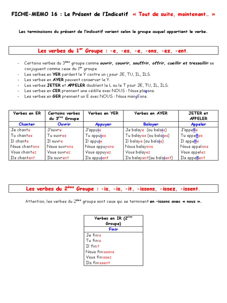 Fiche Memo 16 Present De L Indicatif Syntaxe Regles